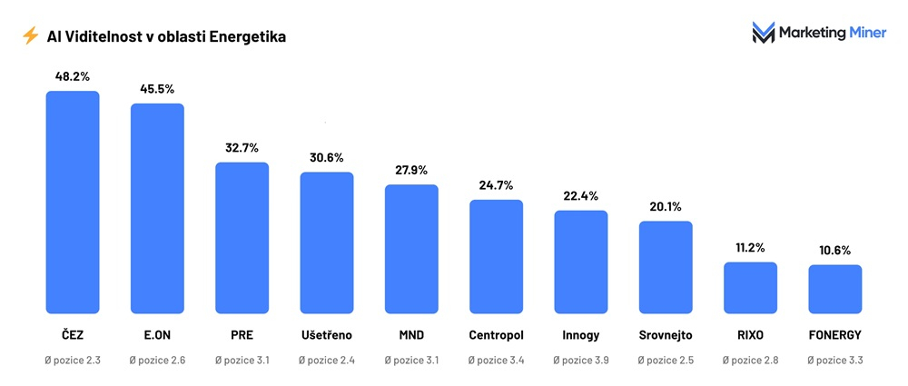 - V energetickém segmentu se vedle tradičních dodavatelů výrazně prosazují také zprostředkovatelé. ČEZ dosahuje 48,2 % a E.ON 45,5 %. Výraznou pozici ale získává i srovnávač Ušetřeno.cz s 30,6 %, který se v Google AI Overviews dostává dokonce na první místo s 49,1 %. AI tak v tomto segmentu často funguje spíše jako rozcestník než přímý doporučovatel konkrétního dodavatele.