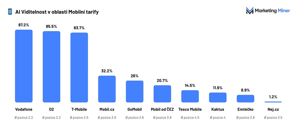 - Nejvyšší koncentraci AI viditelnosti vykazuje segment mobilních tarifů. Vodafone dosahuje 87,2 %, O2 Czech Republic 85,5 % a T-Mobile Czech Republic 83,7 %. Čtvrtý hráč Mobil.cz se objevuje už jen ve 32,2 % odpovědí. AI tak v tomto segmentu pracuje s velmi úzkým okruhem značek a menší operátoři zůstávají výrazně mimo hlavní doporučení.