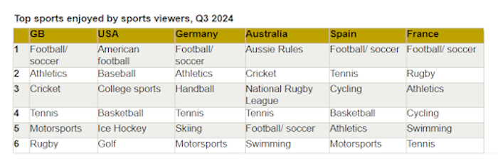 V rámci studie bylo sledováno šest zemí: Austrálie, Francie, Německo, Španělsko, USA a Velká Británie, přičemž nejvíce sledovali sport Francouzi (57 %) a nejméně Britové (41 %). Na evropských trzích byl nejsledovanějším sportem fotbal.