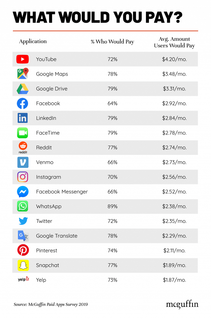 Kolik prostředků by lidé byli ochotni vynakládat za používání Facebooku, YouTube a dalších populárních digitálních platforem? Zdánlivě banální otázka získala v souvislosti se skandály kolem nakládání s uživatelskými daty v rámci největší sociální sítě světa na naléhavosti. Odpověď se pokusila přinést americká agentura McGuffin Group, který prostřednictvím on-line dotazníků u více než dvou tisícovek respondentů zjišťovala, zda by byli ochotni za používání vybraných služeb platit, respektive kolik. Oslovení uživatelé si podle studie nejvíce cení videoportálu YouTube, přičemž za přístup k jeho obsahu by byli průměrně ochotně vynakládat přes čtyři dolary. Následují další služby společnosti Alphabet, a to konkrétně Google Maps a Drive.