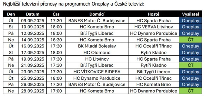 Nový ročník české hokejové Tipsport extraligy začíná v úterý 9. září utkáním České Budějovice – Sparta. Přenos odvysílá Oneplay Sport, který v průběhu sezony nabídne exkluzivně všechny zápasy základní části i play off. Stanice Oneplay Sport 2 a Oneplay Sport 4 odvysílají více než 400 utkání, z toho přes 340 v základní části a více než 60 v play off včetně finále. Česká televize odvysílá na kanálu ČT sport maximálně 36 utkání.