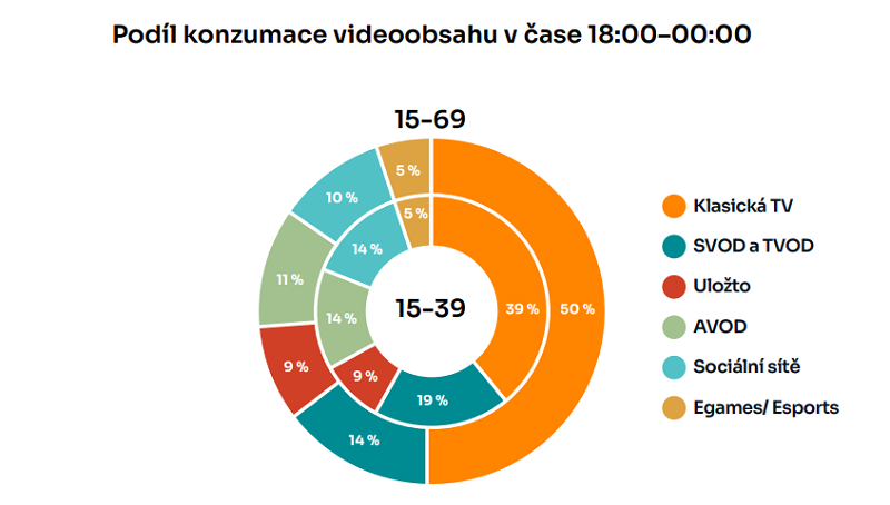 Podle výzkumu Kantar tvoří televize 50 % sledovanosti videa každý večer (od 18:00 do 24:00). Online videa na vyžádání, kde se za jejich sledování platí (SVOD, TVOD), sleduje večer 14 % populace (platí pro CS 15-69). V mladší populaci 15–39 let tvoří televize 39 % veškeré večerní konzumace videa, větší díl než v obecné populaci pak připadá na online videa.
