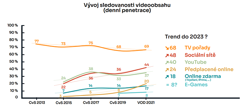 Z něj vyplývá, že lineární televize představuje stále dominantní způsob sledování videoobsahu (69 %). V posledních letech ale roste sledovanost videí na sociálních sítích (44 %), videoportálech typu YouTube (37 %) a zvyšuje se také konzumace předplaceného videa. Předplácet si je má zhruba pětina české populace ve věku 16-65 let. Do roku 2023 se podle těchto dat předpokládá mírný pokles lineární TV a další růst uvedených online videí včetně online videa přístupného zdarma.