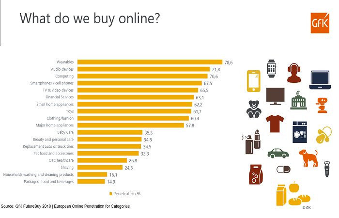 České domácnosti na internetu nakupují spíše technické výrobky, elektroniku, IT produkty. Balené potraviny jsou až na konci žebříčku. Zajímavé je, že už tři z deseti českých domácností nakupují na internetu drogerii. Lidé se přesouvají z kamenných prodejen do online, Češi průměrně nakoupí online 10krát za rok a útrata je 3,5násobně vyšší než na klasickém trhu.