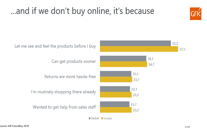 Pokud se rozhodneme nenakupovat na internetu, tak hlavním z důvodů je potřeba produkt vidět a osahat si ho, což požaduje téměř 60 % respondentů. Třetina (34 %) vidí pozitivum na nákupu v kamenné prodejně to, že dostane produkt dříve, než by ho měla při nákupu online a pro 23 % je jednodušší v kamenné prodejně produkt vrátit.