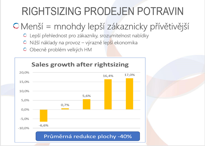U pěti prodejen, kde jsme snížili plochu o 40 %, jsme čekali pokles prodejů o 10 %, ale pouze u jedné prodeje poklesly o 6,6 %, u ostatních čtyř prodeje rostly.