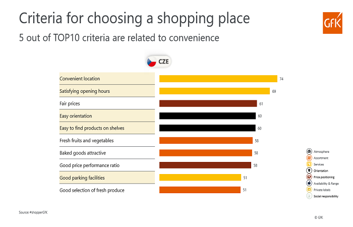 Rozhodujícím faktorem pro výběr konkrétní prodejny už není cena, ta je na třetím místě. Hlavní je poloha a otevírací doba v dobrém čase. Hlavním kritériem při nákupu FMCG produktů je pak pro Čechy místo původu, následuje obsah tuku, cukru, konzervantů, palmového oleje, solí, atd. To předurčuje i další trend, a tím zdraví. Dlouhodobě roste počet rodin, kde je aspoň jeden člen zasažený nějakou alergií nebo potravinovou intolerancí – takových domácností například s alergií na lepek přibylo trojciferně.