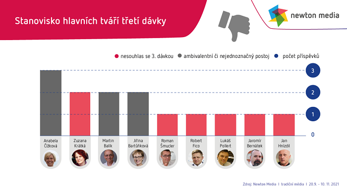 Skoro třetina příspěvků zveřejněných v tradičních médiích vyznívala vůči podávání třetí dávky pozitivně. „Nejčastěji zaznívaly pozitivní postoje z úst ministra zdravotnictví Adama Vojtěcha nebo předsedy České vakcinologické společnosti Romana Chlíbka. Nejvíce redakčního obsahu bylo však věnováno Andreji Babišovi, který se po aplikaci třetí dávky stal pro média jakýmsi symbolem již podstoupeného přeočkování,“ říká Ondřej Polivka, analytik Newton Media. Naproti tomu kritický nebo nejednoznačný postoj vůči třetí dávce byl v tradičních médiích zastoupen jen v 3 % článků. „Opatrný postoj k podávání třetí dávky vyjadřovala hlavně šéfka pražské laboratoře Synlab Anabela Čížková, lékař Martin Balík nebo imunoložka Jiřina Bartůňková. Veškeré zcela odmítavé postoje zazněly ve sledovaném období na webu parlamentní listy.cz, kde mezi hlavní kritiky třetí dávky patřili imunoložka Zuzana Krátká, Roman Šmucler, Robert Fico, Lukáš Pollert, Jan Hnízdil a předseda ČLK ve Zlíně Jaromír Bernátek,“ doplňuje Polivka.