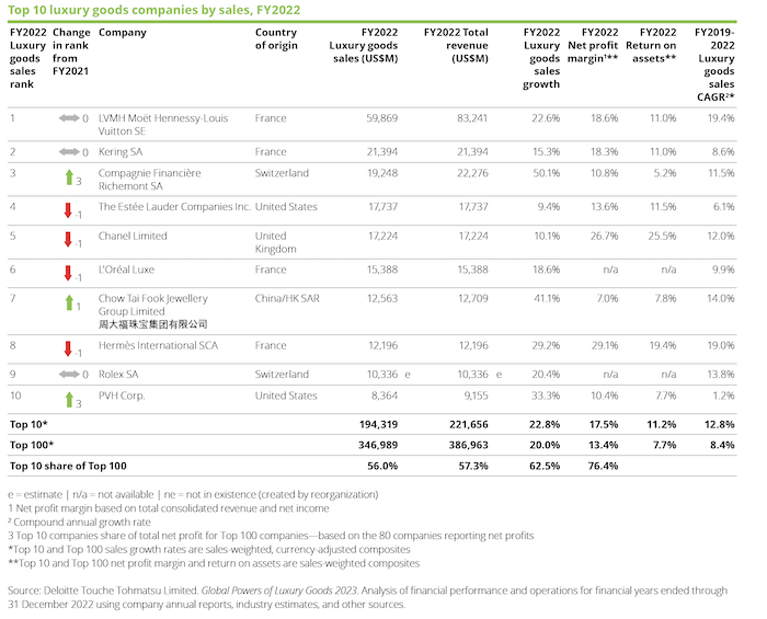 Ve fiskálním roce 2022 dosáhlo 100 největších světových společností zabývajících se výrobou a prodejem luxusního zboží celkových tržeb ve výši 347 miliard dolarů, tedy o 42 miliard dolarů více než v předchozím roce, čímž tak pokořilo hodnoty před pandemií. Tento prudký nárůst signalizuje, že se celý sektor s luxusním zbožím vrací zpět na výsluní. Minimální hranice tržeb pro vstup na žebříček TOP 100 byly příjmy ve výši 284 milionů dolarů.