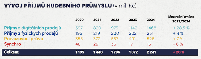 Příjmy hudebního průmyslu loni meziročně vzrostly o 20 % na celkových 2,241 mld. korun. Hlavním zdrojem je přitom v současnosti streaming, který má 64,5% podíl. Celkem si připsal 1,446 mld. korun, tedy o 29 % více než v roce 2023. Podle kvalifikovaného odhadu České národní skupiny Mezinárodní federace hudebního průmyslu (ČNS IFPI) představuje počet platících uživatelů streamingových služeb 2,3 milionů lidí.
