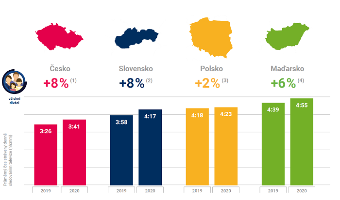 Z okolních států vzrostla televizní sledovanost nejvíce na Slovensku, a to meziročně o 8 %. „Ke stejnému meziročnímu nárůstu došlo také v České republice, ale zatímco u slovenských diváků se zvýšil průměrný čas před televizními obrazovkami na 4 hodiny a 17 minut denně, Češi trávili se svými oblíbenými pořady v průměru 3 hodiny a 41 minut,“ popsal Pavel Müller, Head of Research & Marketing ve společnosti Atmedia.