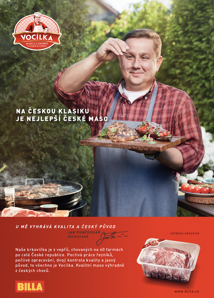 Billa startuje komunikační strategii své privátní značky Vocílka. Značka, jež generuje 20% podíl obratu všech privátních značek obchodního řetězce, bude garantovat i u masných výrobků výhradně český původ. Podporuje ji kampaň s tváří šéfkuchaře Jana Punčocháře.