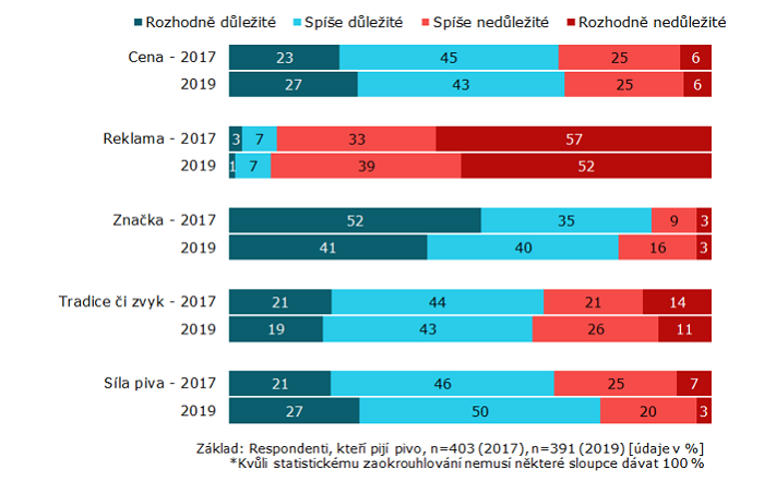 Pivo si dává 44 % dotázaných alespoň jednou týdně, což je o čtyři procentní body více než před dvěma lety. Značka je při výběru sice stále hlavním kritériem (81 %), její důležitost však v čase klesá, v porovnání s rokem 2017 to je o šest procentních bodů méně. Více na ni kladou důraz starší konzumenti, naopak lidé mladší 30 let se o značku zajímají daleko méně často. Zájem o značku se také lineárně zvyšuje se zvyšujícím se vzděláním.