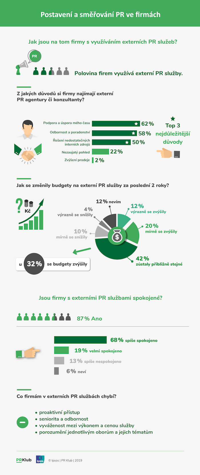 Externí PR služby využívá polovina PR manažerů ve firmách. U třetiny z nich se za poslední dva roky rozpočet na ně zvýšil. S poskytováním služeb je většina spokojena, často jim však u nich chybí proaktivní přístup, odbornost a kritizují také poměr cena výkon. Vyplývá to z průzkumu mapující „Postavení a směřování PR ve firmách“, který realizovala výzkumná agentura Ipsos v říjnu 2019 pro profesní organizaci PR Klub.