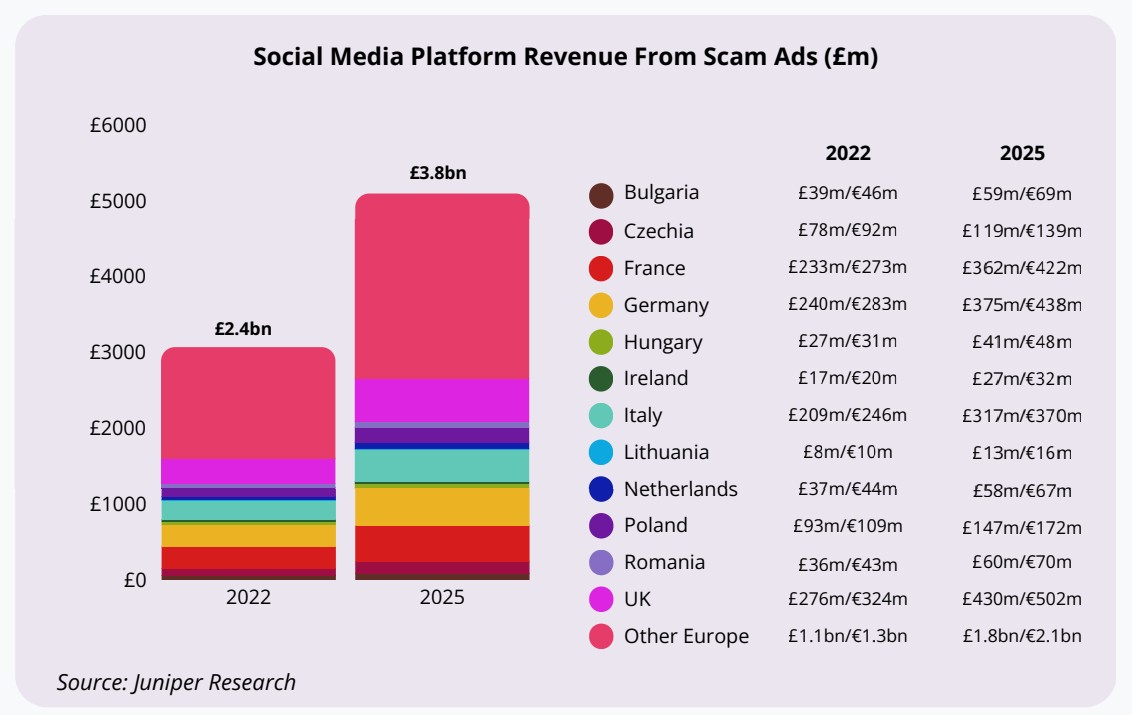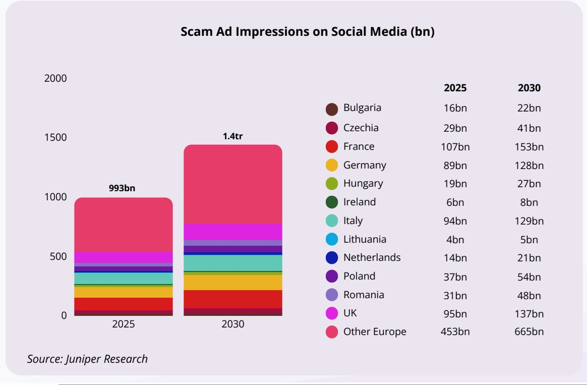 Podvodné reklamy přinášejí sociálním sítím v Evropě miliardové příjmy, zjistila studie Juniper Research. Predikce do roku 2030 je ještě pesimističtější a předpovídá, že průměrný uživatel by se s podvodnou reklamou setkával o zhruba třetinu častěji než dnes.