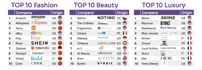 Z hlediska značek e-shopů dominuje v módě stále Amazon, za ním je AliExpress, Temu, eBay, Etsy, Shein, Zalando, Trendyol, Vinted a Cider. V prodeji kosmetiku se na první příčce drží Notino, The Ordinary a Fragrantica, u luxusního zboží Skims, Beyonce a Rarebeauty.