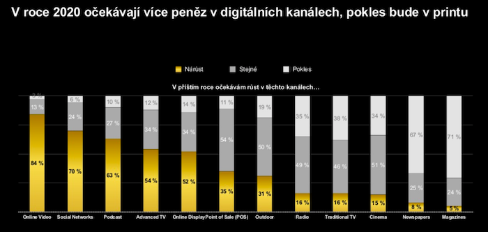 Největší nárůst marketingových investic by se měl projevit u online videa, sociálních sítí a také podcastů, největší pokles u tištěných novin a magazínů.