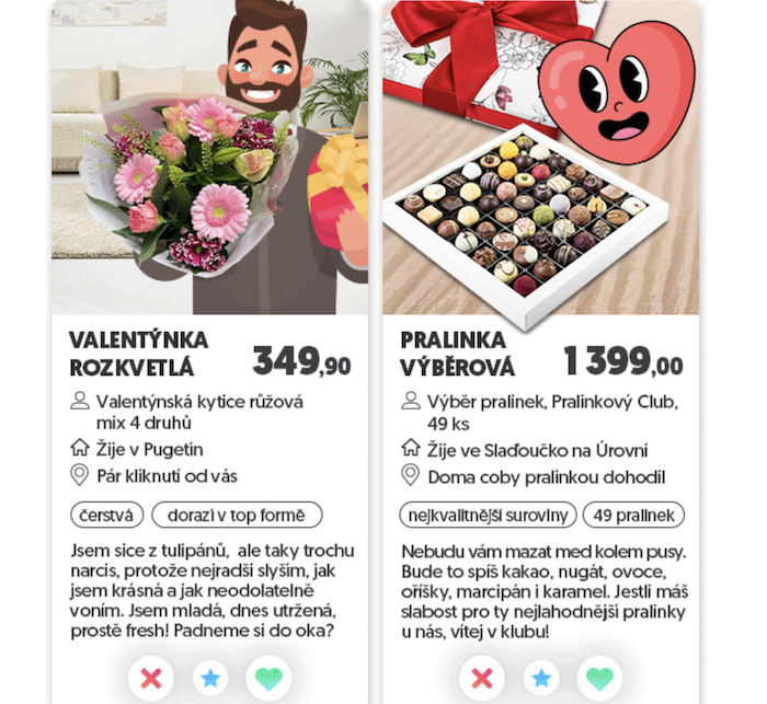 Valentýnský svátek je za dveřmi, a tak firmy hojně zapojují srdce do výloh obchodů, newsletterů či letáků. Symbol lásky se letos dostal i do zcela neobvyklých produktů, například Albert nabízí ve tvaru srdce burger, a to „jen za 39,90“, zakousnout si k němu lze i podobně tvarovanou bagetu – za 39 korun – z pekařství Paul a kdyby toho bylo málo, je možné dodat alespoň něco růžového: dortík, koblížek, donut nebo prosecco. Jako dárek jsou květiny – třeba ve tvaru srdce – sázkou na jistotu, ale pokud by chtěl někdo přidat něco jiného, nejedna firma poskytuje inspiraci. Možné je hledat ji na Heurece, Zootu či na Slevomatu.