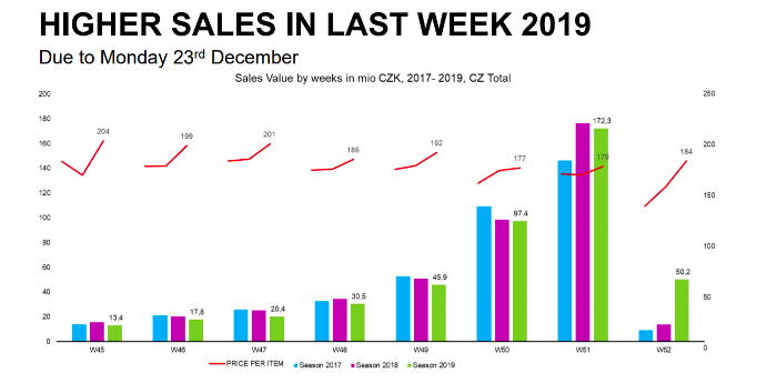 Cenově vycházely předpřipravené vánoční balíčky nejlépe v týdnu od 16. prosince, naopak nejdráže na začátku listopadu. Nejvyšších prodejů bylo dosaženo v týdnu těsně před Štědrým dnem.