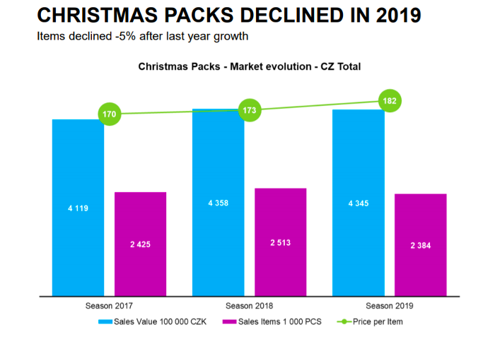Podíváme-li se na prodejní data, počet zakoupených vánočních balíčků meziročně klesl, a to o 5 %. Naopak se zvýšila průměrná cena balíčků z předloňských 173 korun na loňských 182 korun. Spotřebitelé tak minulý rok sice koupili balíčků méně, investovali do nich však více peněz. Vyplývá to jak z deklarací spotřebitelů, tak z maloobchodního auditu.