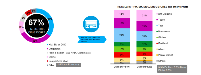 Vánoční kosmetické balíčky nakupují spotřebitelé stále nejvíce v hypermarketech, supermarketech a drogeriích, což deklaruje 67 % z nich. Z řetězců se balíčkům nejvíce dařilo v Dm drogerie markt (21 %), Tescu (19 %) a Tetě (18 %). Zajímavý, i když malý podíl vygenerovaly také lékárny jako Dr.Max (0,9 %), Benu (0,6 %) nebo Pilulka (0,5 %). Na internetu si je zakoupilo 12 %, což by se letos mohlo vzhledem ke změnám chování v důsledku karantény ještě zvýšit. Mnoho lidí si totiž během doby uzavřených kamenných obchodů zvyklo více nakupovat na internetu, a to včetně těch, kteří s tím doposud měli jen malé nebo žádné zkušenosti.