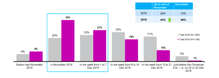 Vánoční balíčky kupují spíše ženy (63 %), spotřebitelé všech věkových skupin od 18–54 let, u starších zájem o ně klesá. Lidé balíčky oproti předloňskému roku kupovali obecně o něco dříve, a to na přelomu listopadu a prosince, což bylo ovlivněno především akcemi řetězců. V roce 2018 to bylo až během prvních třech týdnů v prosinci. Nákup na poslední chvíli, tedy 23. a 24. prosince, volí pouze zanedbatelné procento spotřebitelů – v roce 2018 to bylo u 5 % dotázaných, loni jen u 1 %.