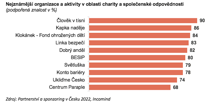 Sponzorování nejrůznějších aktivit si Češi nejvíce spontánně spojují se společnostmi Škoda a ČEZ. Z potenciálních cílů sponzoringu nejvíce znají Jaromíra Jágra a obecně mají rádi hokej. V rámci charitativní činnosti zaznamenala největší meziroční nárůst povědomí organizace Člověk v tísni. Vyplývá to z letošního výzkumu „Partnerství a sponzoring v Česku“ agentury Incomind.