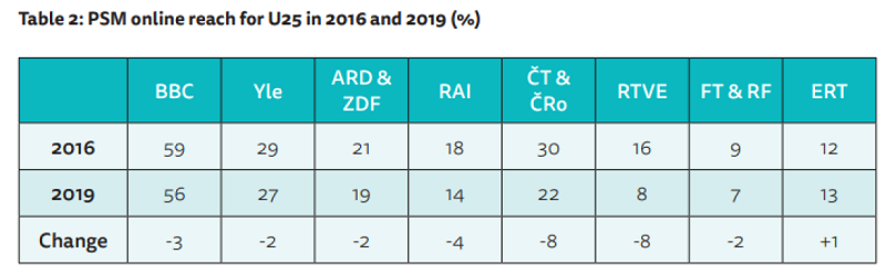 Online platformy jako Facebook a YouTube jsou v mnoha evropských zemích mladými lidmi (18-25) častěji využívány jako zdroje online zpráv než veřejnoprávní média. V případě generace starší 55 let je naopak zásah médií veřejné služby vysoký a představuje necelou polovinu z celkového týdenního zásahu. Podle studie je online zásah ČT a ČRo v populaci 18-25 let 22 %, což je ze zkoumaných zemí třetí nejlepší výsledek po BBC (56 %) a finské YLE (27 %). Za poslední tři roky se ale podle studie dosah online nabídky médií veřejné služby v mladé populaci snižuje.