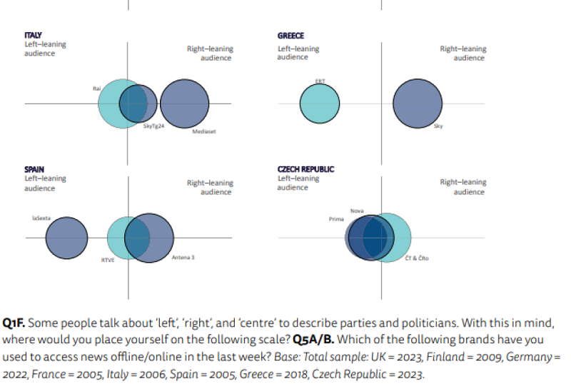 Studie také zkoumala, jak si stojí média veřejné služby a komerční média při oslovování publika podle politické orientace na ose pravice-levice. Čím více jsou mediální organizace umístěny ve středu grafu, tím více mají vyvážené publikum podle politických názorů. Zatímco média veřejné služby se ve většině zkoumaných zemí drží uprostřed, většina komerčních provozovatelů oslovuje více pravicové publikum. Výjimkou je ale Česká republika, kde jsou Prima a Nova vlevo od médií veřejné služby. Částečnou výjimku tvoří také Španělsko, kde laSexta oslovuje podle studie levicové publikum.