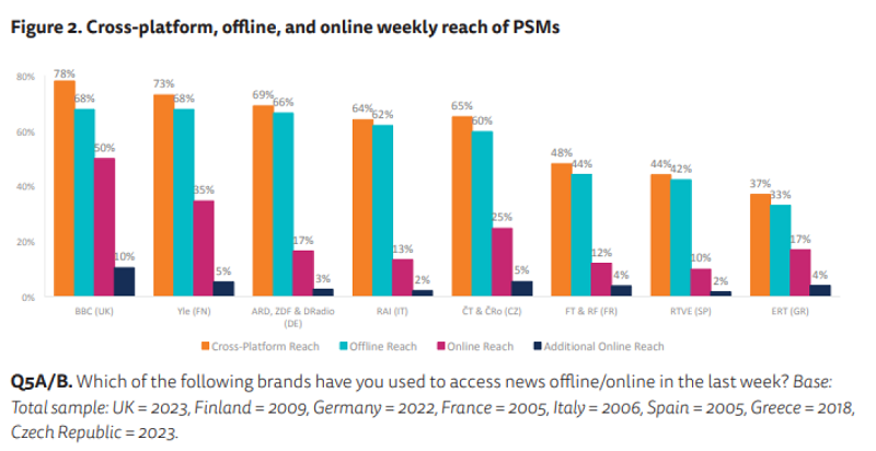 Z grafu níže je vidět, že společný týdenní zásah online a offline nabídky BBC představuje 78 %, zatímco zásah jen offline vysílání tvoří 68 %. V případě ČT a ČRo má podle studie představovat kombinovaný týdenní zásah online a offline 65 %, zatímco zásah jen offline vysílání je 60 %. Srovnání níže také ukazuje, že online dosah BBC je nejvyšší ze všech zkoumaných médií veřejné služby.