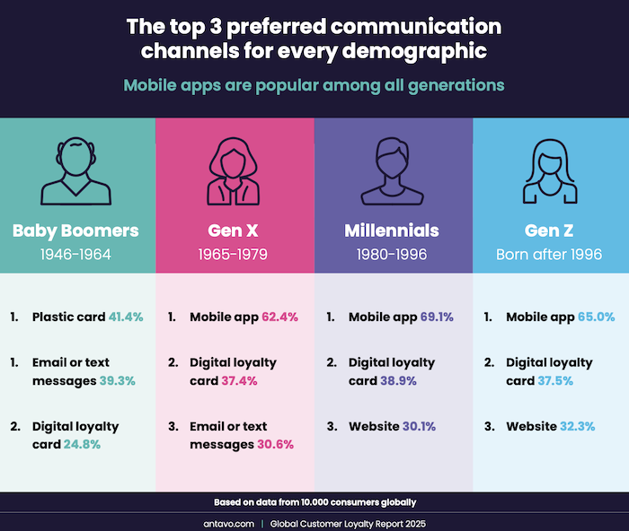 Nejčastěji je využíván věrnostní program přes mobilní aplikaci, za ní následuje digitální věrnostní karta. Jen u generace Baby Boomers, narozené v letech 1946–1964, stále vedou plastové kartičky a e-mail či SMS.