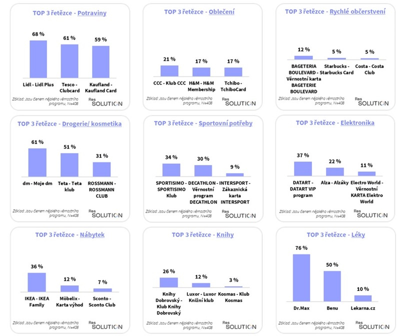 Nejčastěji se užívají věrnostní programy u prodejců potravin (98 %), prodejců léků (88 %) a prodejců drogerie a kosmetiky (80 %). Uvedeny jsou podíly z těch, kteří jsou členem nějakého věrnostního programu.