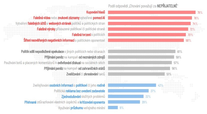 Etika v politice a politických kampaních je přitom pro 90 % Čechů důležitá. Zároveň nadpoloviční většina (55 %) věří, že v politice je možné uspět a dodržovat přitom etické zásady. Přítomnost dezinformací v předvolební kampani pak podle slov 46 % Čechů negativně ovlivňuje jejich chuť účastnit se voleb. Více než dvě třetiny Čechů (74 %) se domnívají, že by na etické chování politiků mělo být dohlíženo.