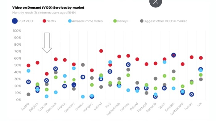 Z dat organizace EBU (Unie pro evropské veřejnoprávní vysílatele) vyplývá, že v populaci 16-64 let je iVysílání v měsíčním zásahu na uživatele v blízkosti Netflixu (iVysílání.cz je přístupné volně, nikoliv přes předplatné, pozn red.), v mladší skupině 15-24 let je ale odstup Netflixu od iVysílání větší a iVysílání je v této kategorii na srovnatelné úrovni jako Disney+. Srovnání využívanosti VOD v Česku s jinými zeměmi zároveň ukazuje, že český trh je spíš konzervativní a „televizní".