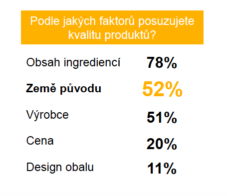 Původ z různých zemí je navíc českými spotřebiteli vnímán různě. Pozitivní konotace mají výrobky nejen české, které za kvalitní považuje 96 % Čechů, ale i německé, rakouské, nizozemské (shodně 92 %), anglické (86 %) a slovenské (83 %). Naopak negativně jsou vnímány výrobky s původem rumunským (91 %), čínským (88 %), polským (83 %) a ruským (72 %).