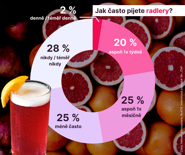 Stoupající popularitě se těší ochucená piva neboli radlery. Ty sice pro Čechy stále nejsou nápojem pro každodenní pití (denně si je dají jen 2 % dotázaných), ale aspoň jednou týdně po nich sáhne už pětina lidí (o 5 procentních bodů více než před dvěma lety) a s nižší frekvencí je pije polovina vzorku. Procento těch, kteří si ovocná piva nedají nikdy, se aktuálně blíží procentu odmítačů tradičního piva: je jich 28 %. Popularita těchto piv se v porovnání s výsledky z roku 2020 zvýšila hlavně u mužů (o 19 procentních bodů), kteří už radlery pijí ve srovnatelné míře jako ženy – alespoň někdy po nich sáhne 70 % mužů a 74 % žen.