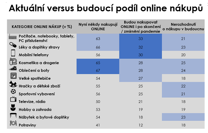 Covid podpořil online nákupy i v kategoriích, které lidé obvykle chtějí vidět, vyzkoušet v obchodech, např. oblečení a , léky a doplňky stravy, kosmetika a drogerie, ale také potraviny a hračky. Přestože tyto kategorie začalo nakupovat více lidí online, neznamená to, že tyto nárůsty pokryly celkové poklesy prodejů některých segmentů. Absolutní pokles je zřejmý zejména u oblečení a bot. Potraviny jsou kategorií, kterou bez ohledu na šíření viru online nenakupuje nebo nemá možnost nakupovat nejvíce obyvatel (59 %).