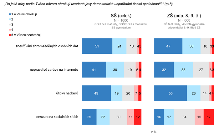 Přibližně tři čtvrtiny žáků a studentů předpokládají silnou přesvědčovací efektivitu sociálních sítí a domnívají se, že se jimi většina Čechů nechá snadno zmanipulovat. S tímto tvrzením souhlasí 75 % středoškoláků a 71 % základoškoláků. Zároveň mezi středoškoláky vzrostlo ve srovnání s rokem 2018 vnímání ohrožení demokracie nepravdivými zprávami na internetu (o 8 %) a útoky hackerů (o 7 %). Nadpoloviční většina respondentů se kloní k tomu, aby byly nepravdivé zprávy na internetu odstraňovány (54 % středoškoláků a 61 % základoškoláků). Podíl středoškoláků, kteří se vyjádřili pro odstraňování nepravdivých zpráv, však ve srovnání s výzkumem z roku 2018 poklesl o 11 %, a to ve prospěch řešení pouhým označováním (k tomu se přiklání 27 % středoškoláků).