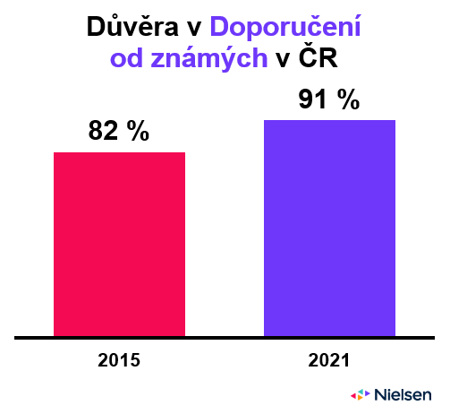 Při pohledu na česká data o důvěře v jednotlivé reklamní komunikační kanály zřejmě nikoho nepřekvapí, že nejvíce respondenti věří doporučením svých známých: jako důvěryhodný „komunikační kanál“ je označilo 91 % z dotázaných.
