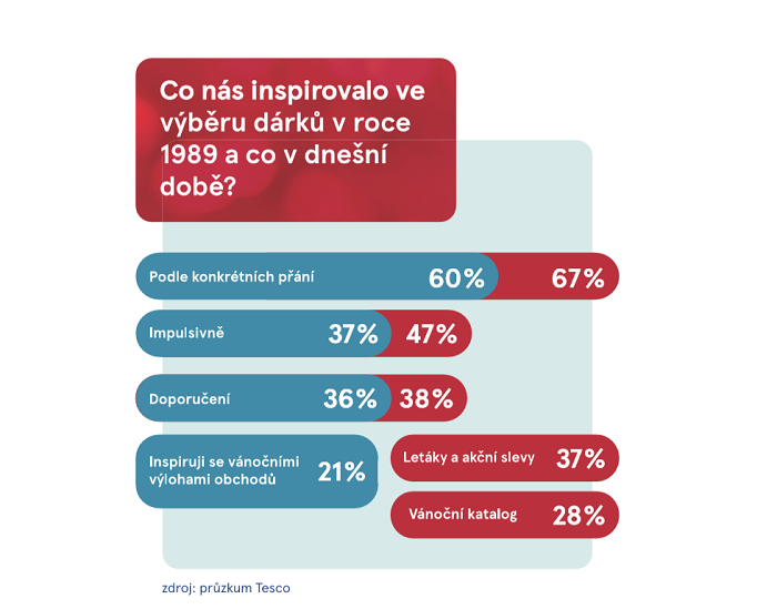 V předrevoluční éře i v současnosti dávají Češi při nákupu na doporučení rodiny a přátel, dnes navíc čtou ještě letáky. U zákazníků hraje důležitou roli vánoční katalog, ten ovlivní až 30 % z nich, a různé reklamní formáty anebo předváděcí a ochutnávkové akce přímo v obchodech (15 %). Téměř každého desátého zákazníka ovlivní i influenceři a reklama na sociálních sítích. Před rokem 1989 se při nákupech impulsivně rozhodovala víc než třetina Čechů, dnes tyto nákupy přiznává téměř polovina nakupujících.