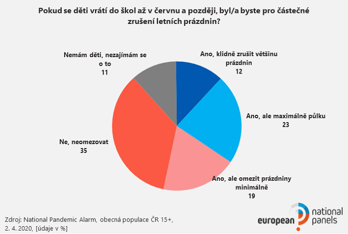 Polovina Čechů očekává, že se děti vrátí do škol až po prázdninách. Polovina souhlasí s větším či menším omezením prázdnin, třetina je proti jakémukoliv omezení. Pro omezení prázdnin jsou častěji muži a lidé nad 60 let.