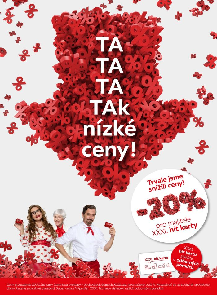 XXXLutz spouští novou marketingovou kampaň s názvem „Ta ta ta tak nízké ceny!“ Ta navazuje na legendární komunikaci, kterou značka používala před lety, a oznamuje trvalé snížení cen o 20 procent pro držitele věrnostní XXXL hit karty. Slevy se týkají veškerého sortimentu nábytku a bytových doplňků, s výjimkou kuchyní.