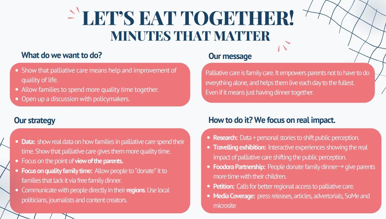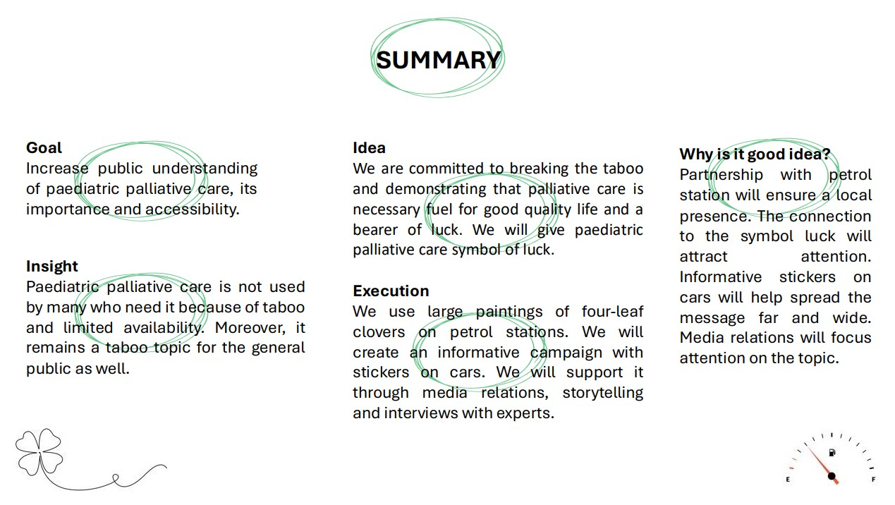 Soutěžící měli navrhnout PR kampaň, která pomůže překonat tabu spojená s dětskou paliativní péčí a zvýší povědomí o její komplexnosti. Kampaň měla oslovit širokou veřejnost, novináře, tvůrce obsahu i politiky a upozornit na nutnost dostupné a variabilní péče napříč regiony ČR. Návrh je připravován pro organizace Česká společnost paliativní medicíny a Pallium.