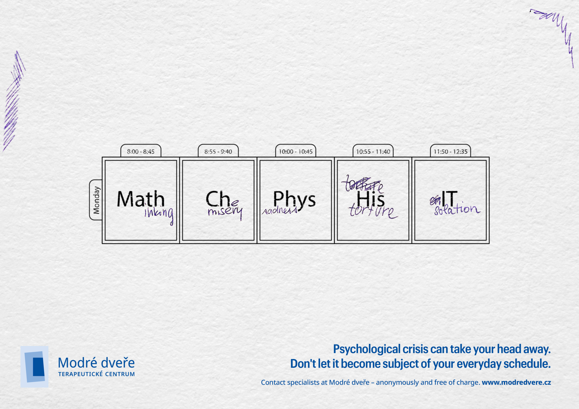 Soutěžící měli za úkol vytvořit návrh tiskové reklamy, která zvýší povědomí o krizové pomoci poskytované centrem Modré dveře a motivuje lidi v psychické tísni k využití této služby. Reklama by měla oslovit širokou veřejnost, destigmatizovat vyhledání odborné pomoci a vést ke zvýšení počtu lidí, kteří se na krizovou pomoc obrátí. Nezisková organizace Modré dveře se zaměřuje na podporu duševního zdraví a poskytování krizové intervence.
