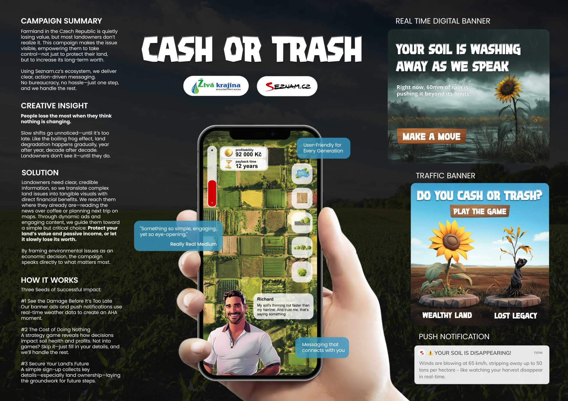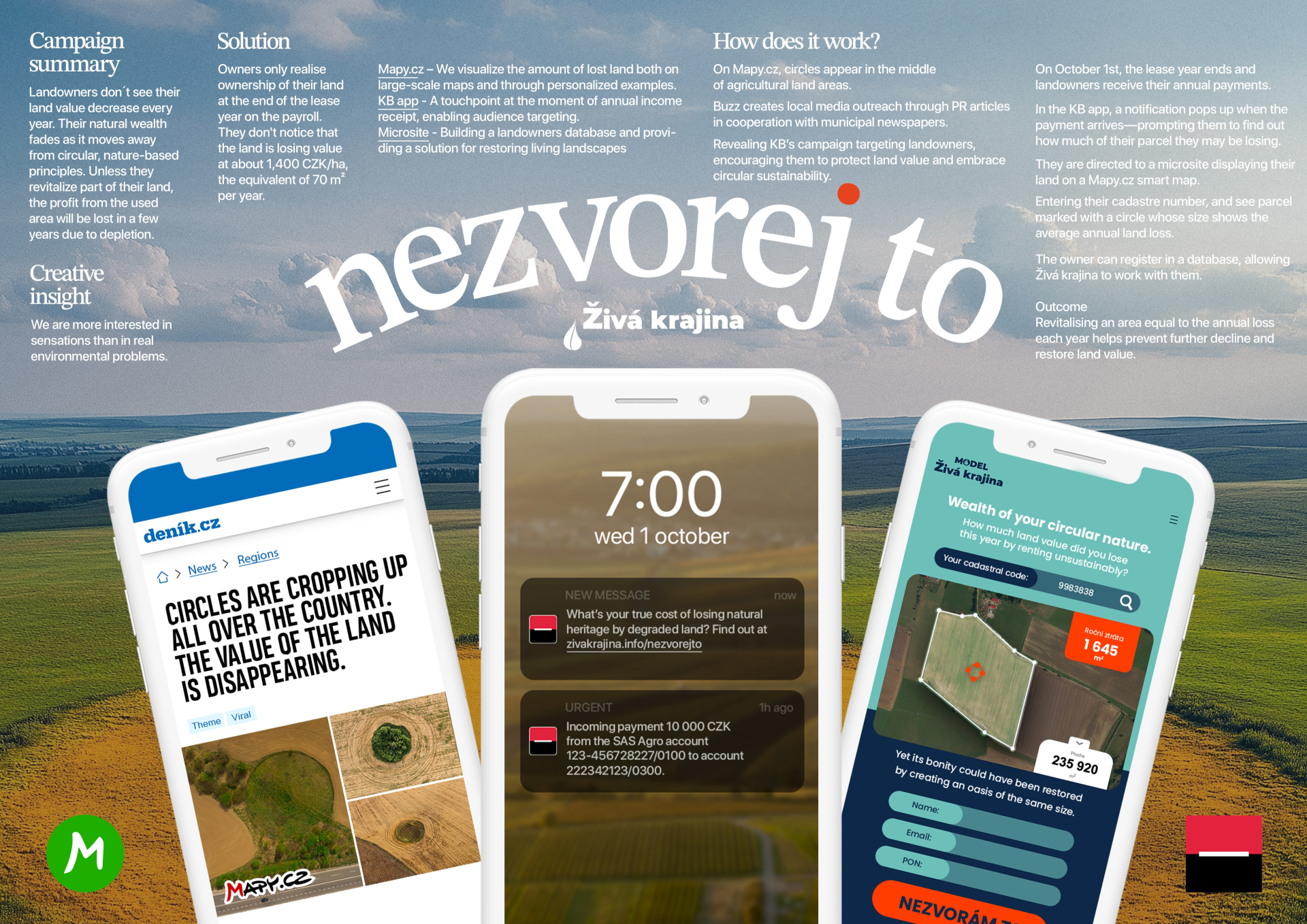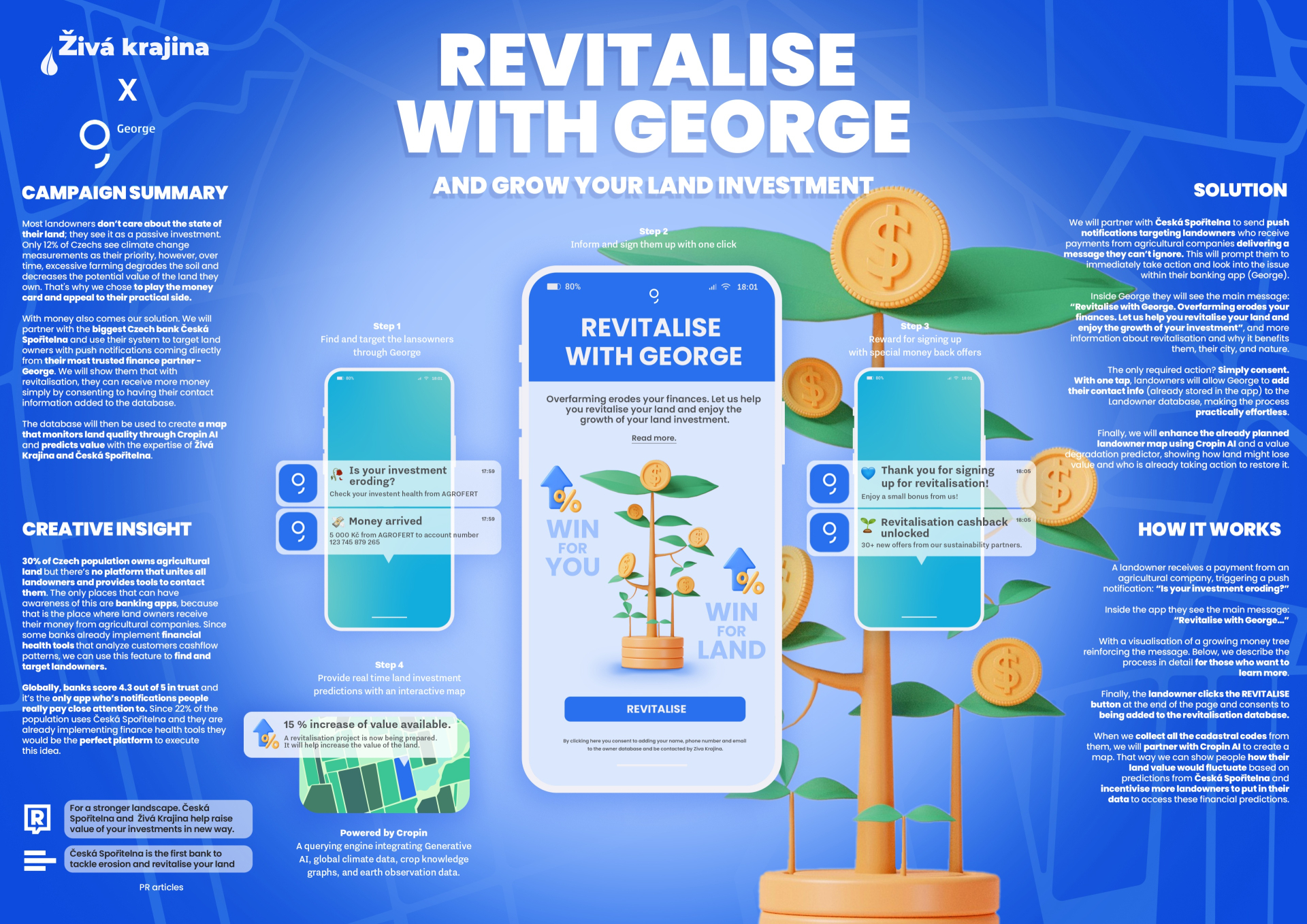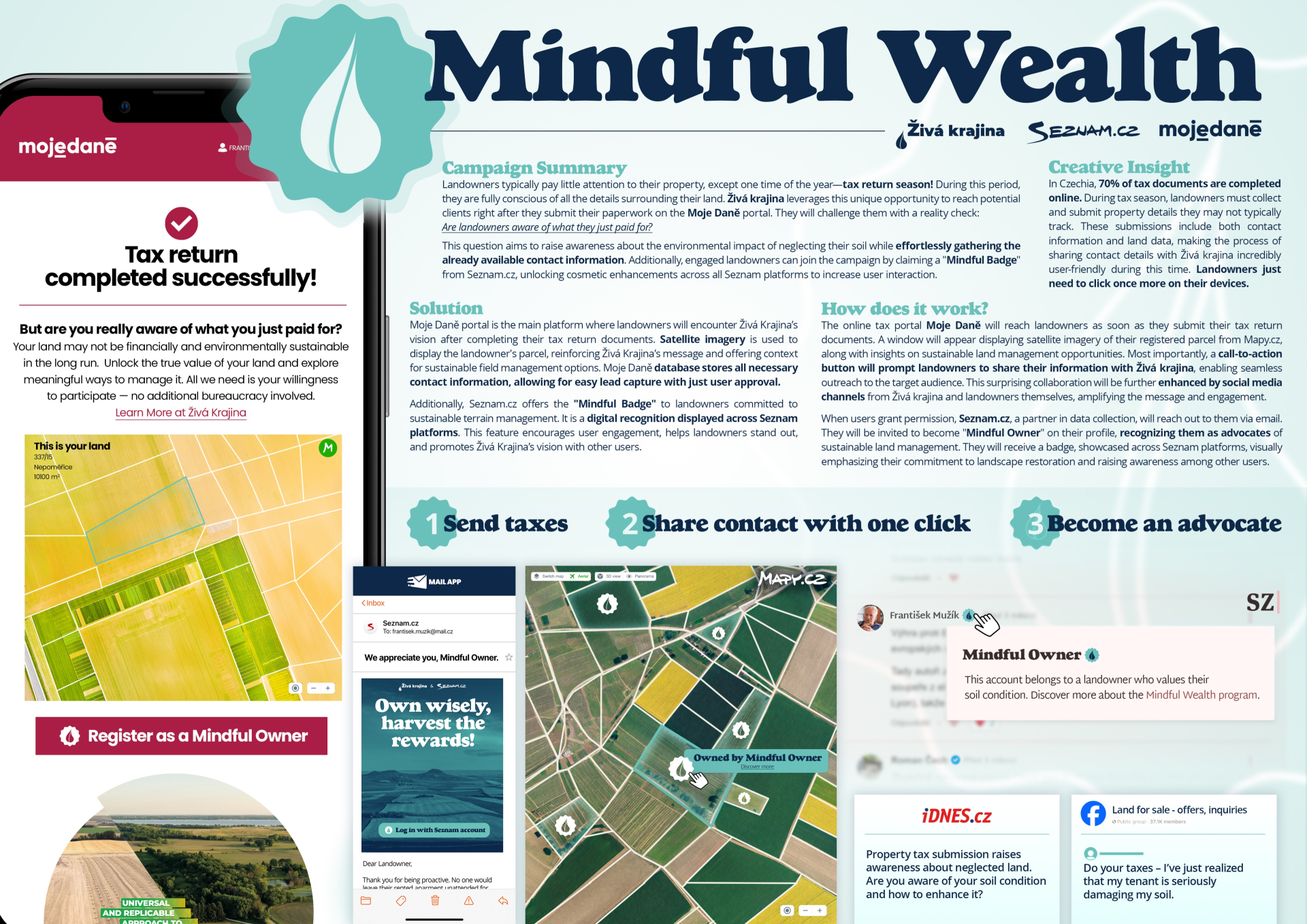 Soutěžící měli vytvořit marketingovou kampaň, která motivuje vlastníky zemědělské půdy k zapojení do projektu na opatření obnovy krajiny. Kampaň měla efektivně oslovit dvě hlavní cílové skupiny – starší generaci vlastníků vnímajících půdu jako rodinné dědictví a mladší generaci rozhodující se na základě investičního potenciálu – a vést je k jednoduchému kroku: vyplnění online formuláře. Návrh je určen pro iniciativu Živá krajina.