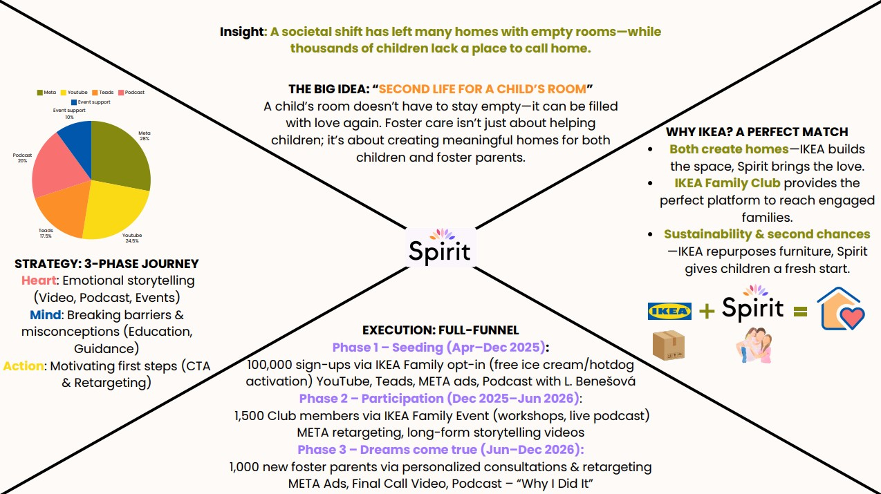 Soutěžící měli navrhnout kampaň, která osloví veřejnost a motivuje 1000 nových rodin k pěstounství. Kampaň měla zvýšit povědomí o pěstounské péči, získat 100 tisíc pravidelných sledujících a přivést 1500 vážných zájemců do pěstounského klubu. Návrh je připravován pro organizaci Spirit, která podporuje pěstounství a usiluje o to, aby žádné dítě nemuselo vyrůstat v ústavu.