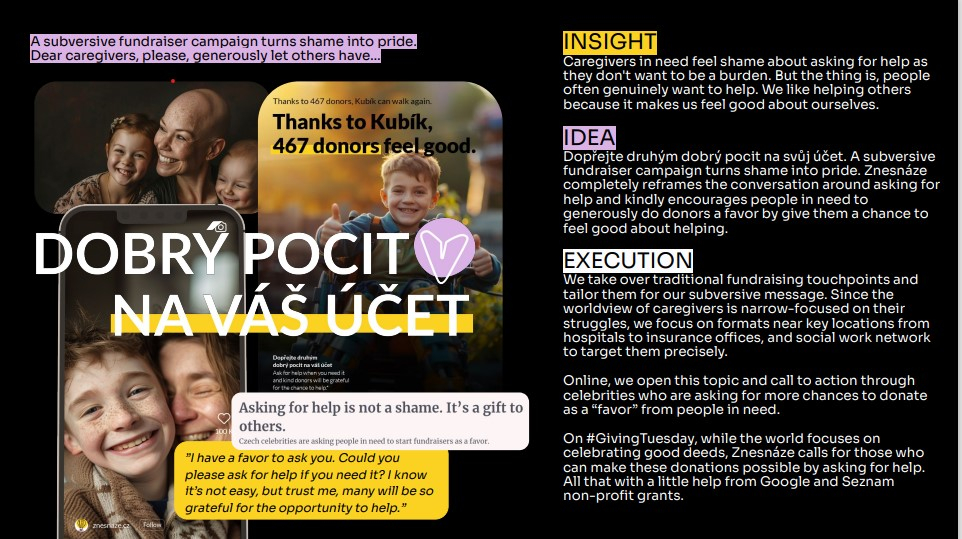 - Za návrh printové reklamy pro organizaci Domov sv. Anežky byli zlatem oceněni Martin Božík a Yousef Yaghmour z Leo Burnett.