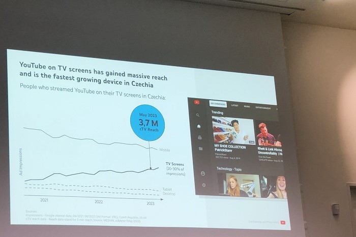 Obsah video platformy YouTube streamuje přes chytré televizory 3,7 milionů uživatelů měsíčně. Měsíční dosah YouTube v Česku je pak 7,4 milionů v cílové skupině 15-79 let. Data s odkazem na měření AdMeter od agentury Median zveřejnil na čtvrteční konferenci Innovation Lab od Visibility Digital Peter Mižík z Googlu. Dodal, že asi třetina všech impresí YouTube se tak zobrazuje na chytré televizi. Největší podíl impresí je generován na mobilních telefonech.