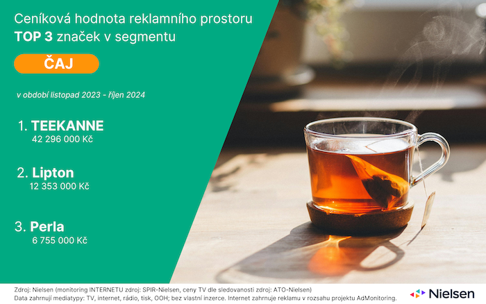 Za období od loňského listopadu do letošního října inzerovala v kategorii čajů nejvíce značka Teekanne, jež do reklamy investovala 42,3 milionů korun. Za ní je s velkým odstupem Lipton (12,4 mil. korun) a Perla (6,8 mil. korun). Vyplývá to z monitoringu reklamy Ad Intel výzkumné agentury Nielsen, který sleduje ceníkovou hodnotu reklamy.