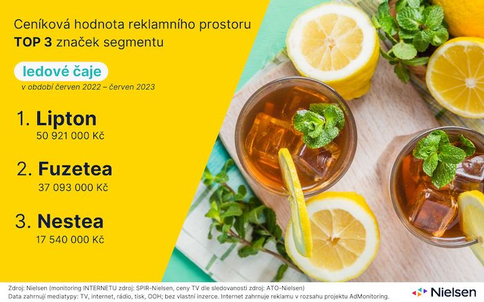 V období od loňského do letošního června patřily k nejsilnějším inzerentům v kategorii ledových čajů značky Lipton, Fuzetea a Nestea. Vyplývá to z monitoringu reklamy Ad Intel výzkumné agentury Nielsen, která sleduje ceníkové ceny inzerce. Lipton za poslední rok investoval do inzerce téměř 51 milionů korun, Fuzetea 37 milionů koruna. Nestea 17,5 milionů korun.